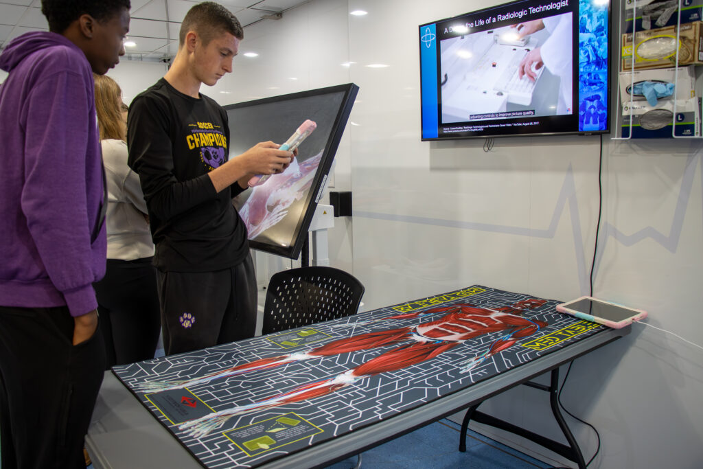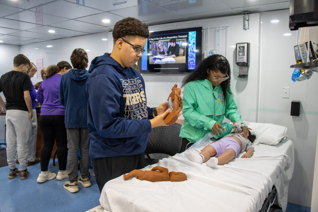 Inside the mobile unit, students found seven patient care bays complete with medical air, suction, oxygen, patient monitors, and divider curtains—just like a real hospital. They explored careers such as nursing, radiology technology, surgical technology, respiratory therapy, and emergency medical services (EMS).