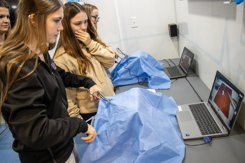 Students even got to test their precision and coordination using a laparoscopic trainer! They had to unwrap a Tootsie Roll using tweezers—just like surgeons practice using fine instruments during surgery!